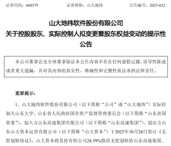 同日,山大地纬(688579)公告,公司实际控制人山东大学、山东省人民政府国有资产监督管理委员会(简称“山东省国资委”)、划入方山东高速集团有限公司(简称“山东高速集团”)、划出方山东山大资本运营有限公司(简称“山大资本”)于2025年10月24日签订《无偿划转协议》,山大资本将其持有的公司24.59%股份无偿划转给山东高速集团。