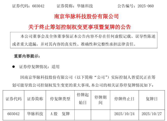 此外,10月20日华脉科技(603042)因筹划控制权变更事项停牌。10月24日晚间该公司披露,停牌期间,公司就筹划控制权变更事项进行了充分探讨,但由于涉及事项较多,与交易对方就核心事项未达成共识,经慎重考虑,交易双方决定终止筹划本次重大事项。经公司向上海证券交易所申请,公司股票将于2025年10月27日(星期一)上午开市起复牌。