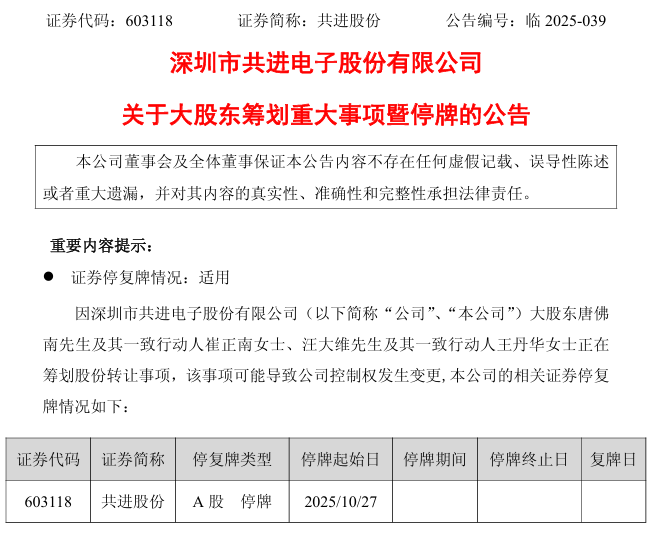 共进股份(603118)10月24日公告,公司近日收到大股东唐佛南及其一致行动人崔正南、汪大维及其一致行动人王丹华通知,其正在筹划有关公司的股权转让事宜,该事项可能导致公司的控制权变更。