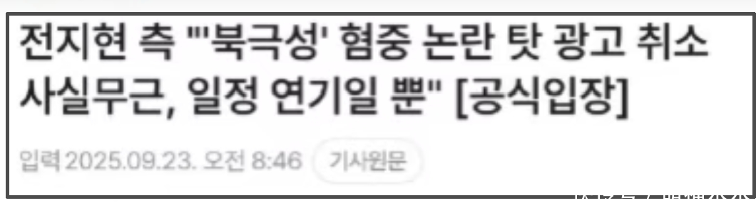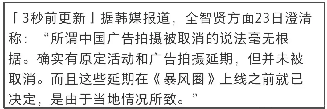 从“中国服装品牌原计划让全智贤代言”来看这大约是全智贤的新代言,还处在物料筹备阶段。可能是直接影响到了实际的金钱利益,全智贤方面火速回应,称“所谓中国广告被取消的说法毫无根据,只是原定活动和广告拍摄延期,并未被取消,而且时间早于《暴风圈》播出前,是场地原因”,字里行间都在澄清“未被中国品牌解约”,还试图撇清受制于《暴风圈》引起的辱华风波。