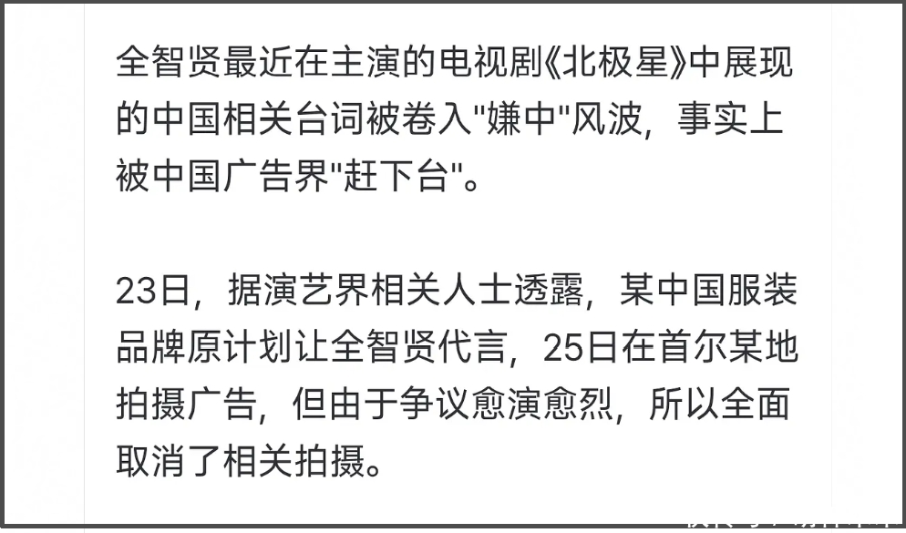 据韩媒业内爆料,全智贤辱中风波发酵尤为强烈,在中国的代言遭到大范围抵制。直接影响到她原计划要代言的中国服装品牌,业内称该广告原本预计25日在韩国首尔落地拍摄,目前相关拍摄已取消。